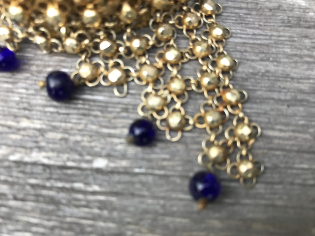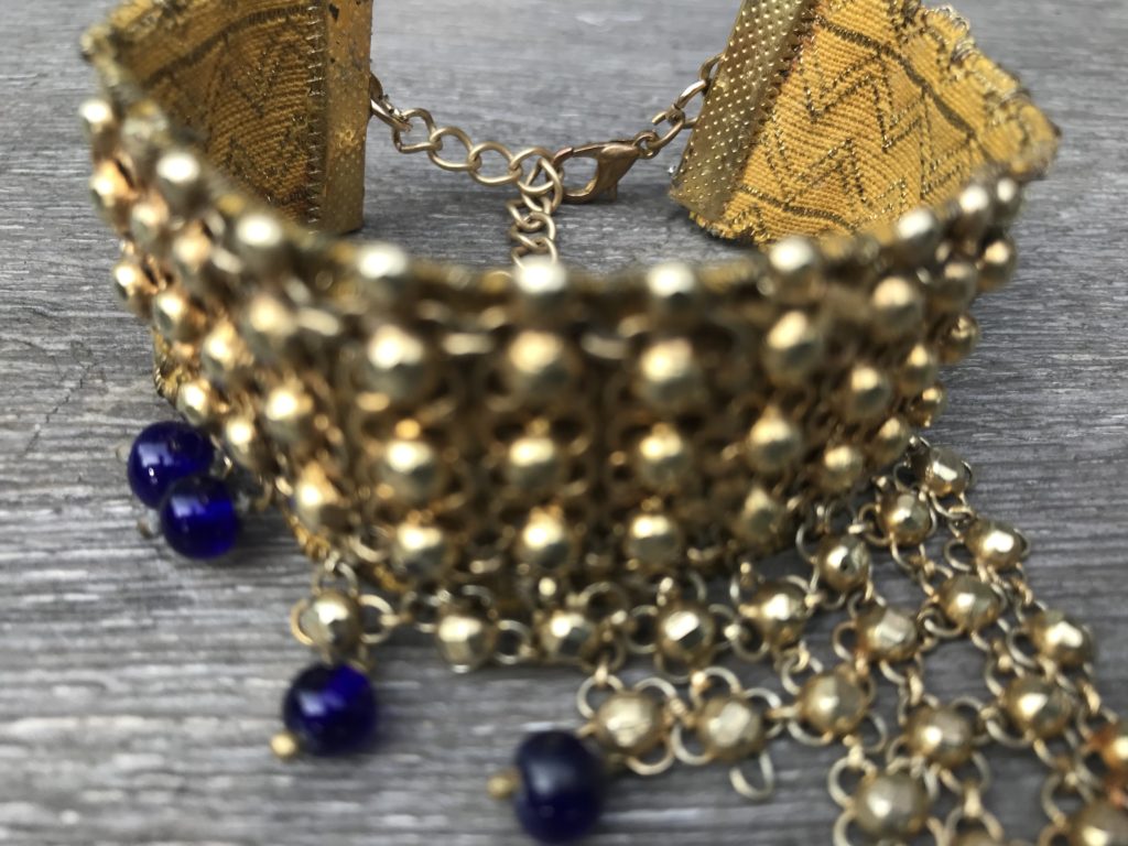 Gilded Brass Chain with Lapis Lazuli Asymmetrical Vintage Bracelet on a 1800’s gold ribbon. One size fits all with extension chain.